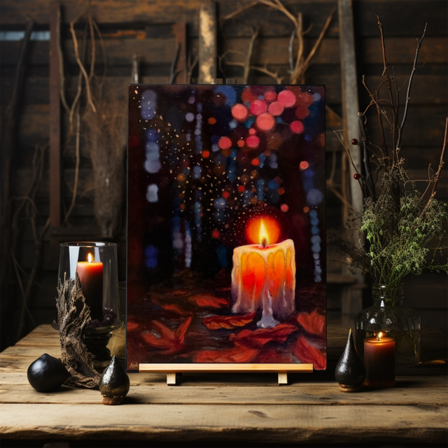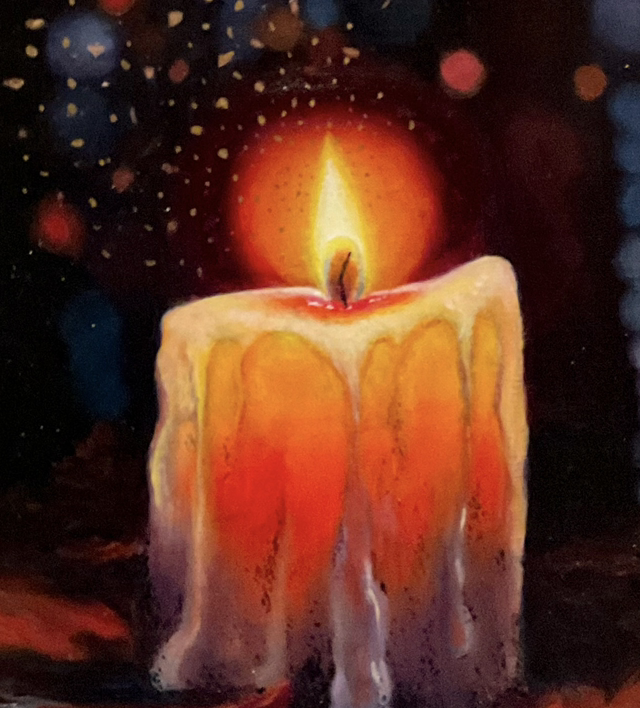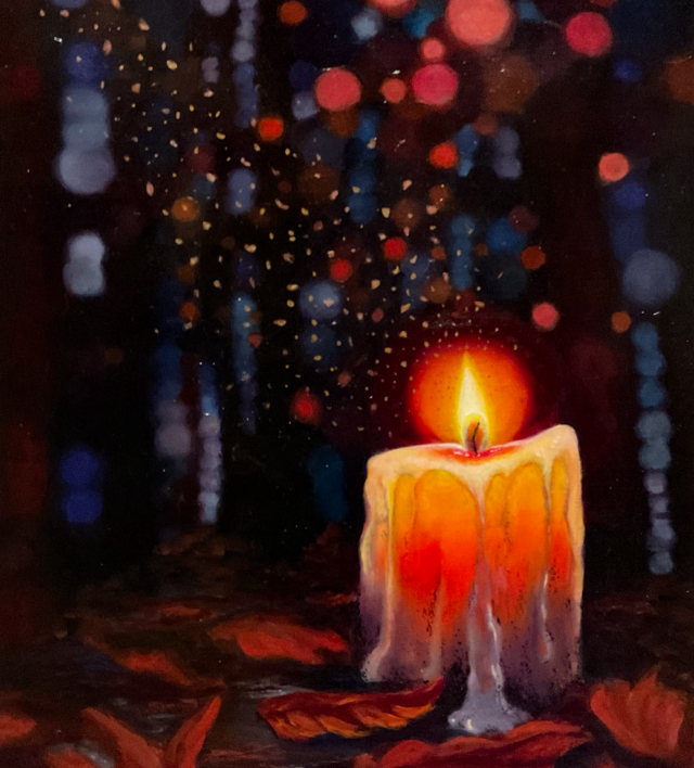 In each artwork there is a candle nestled amongst the leaves on the woodland floor, illuminating the beautiful textures of the surrounding trees.