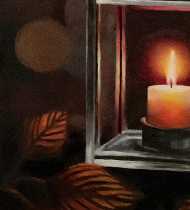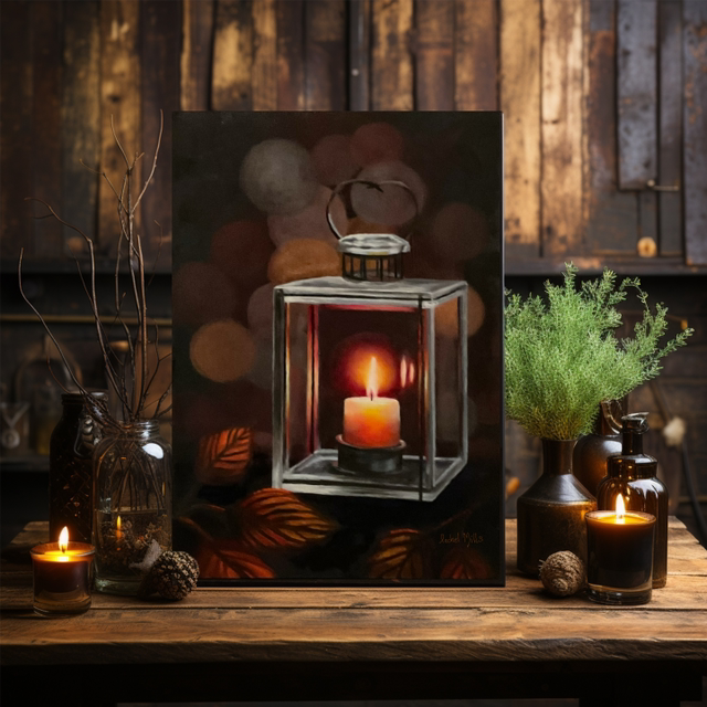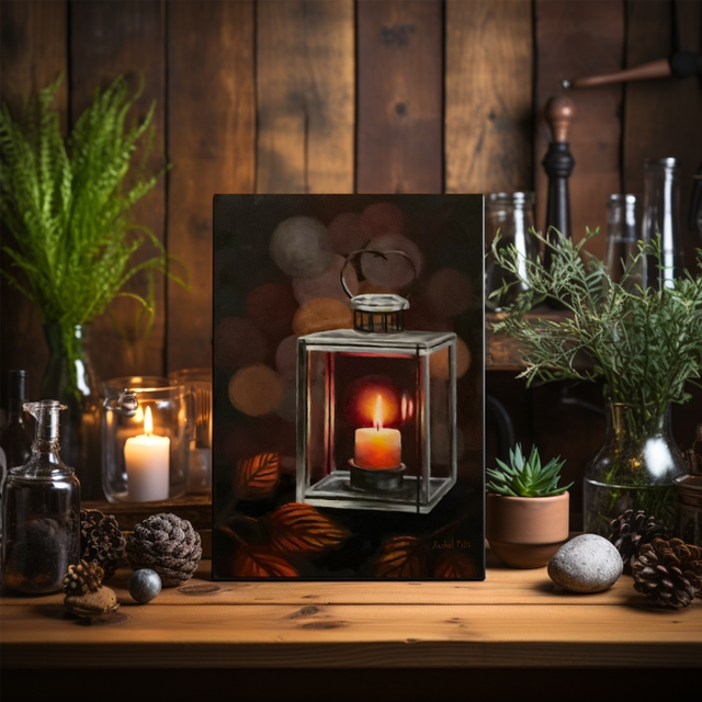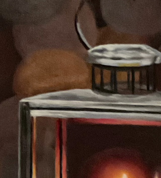 The candles inside the lantern in these paintings are painted with the finest pure oil pigments so the flame appears to glow from within, like a candle that never goes out.
